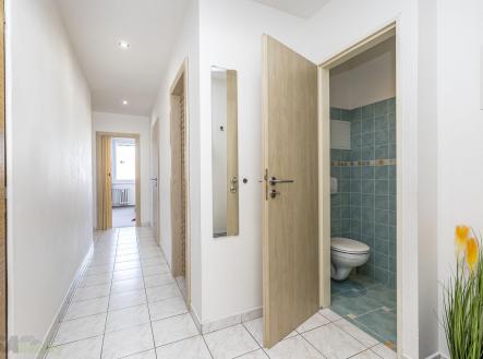Dispozici bytu tvoří vstupní předsíň, prostorný obývací pokoj s jídelnou a kuchyní, dvě ložnice, komora, koupelna s vanou a sprchovou zástěnou a samostatné WC. Na obývací pokoj a jídelnu navazuje lodžie, která nabízí příjemné posezení a dostatek soukromí díky vzrostlé zeleni v okolí domu.